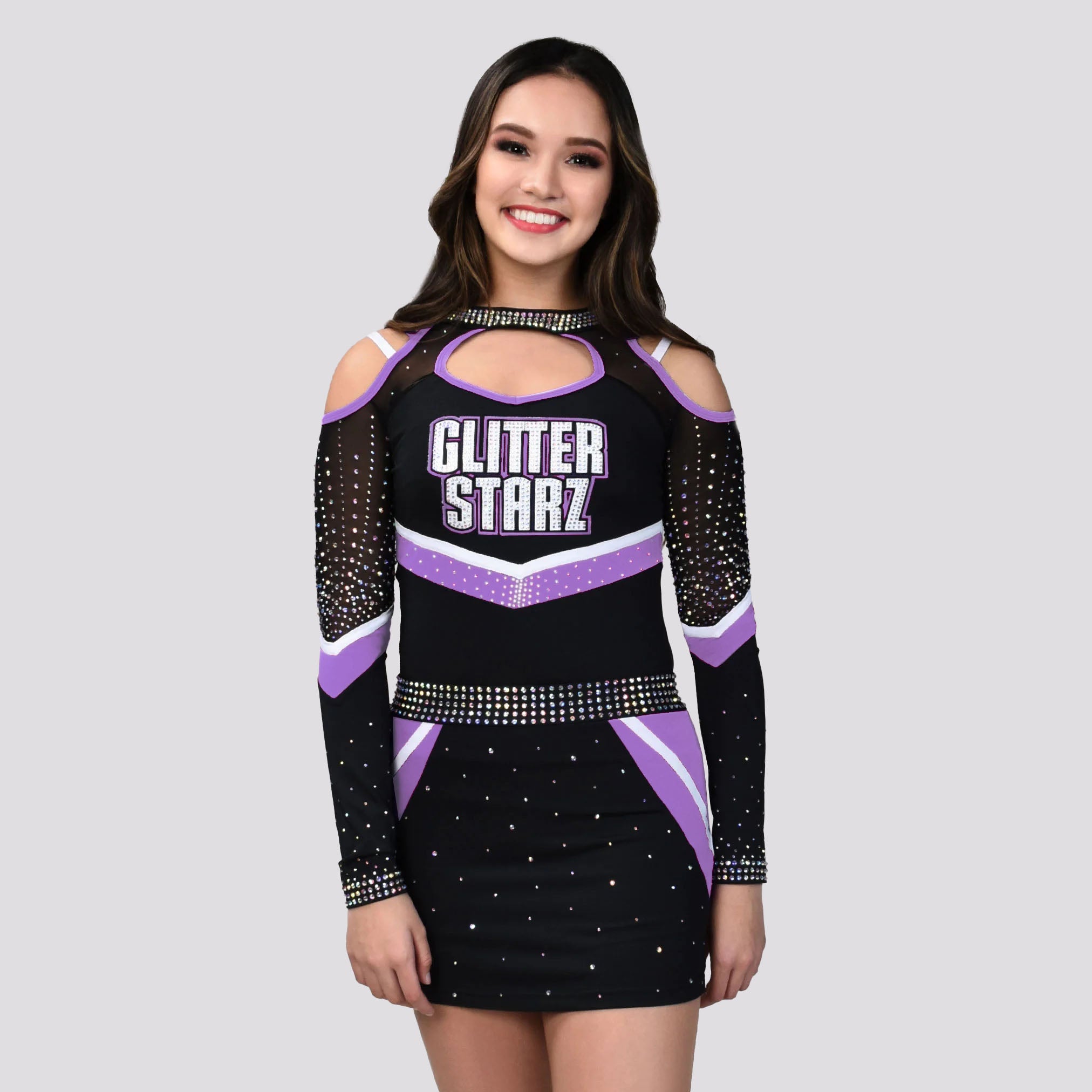 Contact your team stylist or use the form below to customize this Glitterstarz Uniform to fit your team's colors, logo, and top/bottom type.  Top type shown: Crop Top Bottom type shown: Standard Skirt with added binding Fabrics...