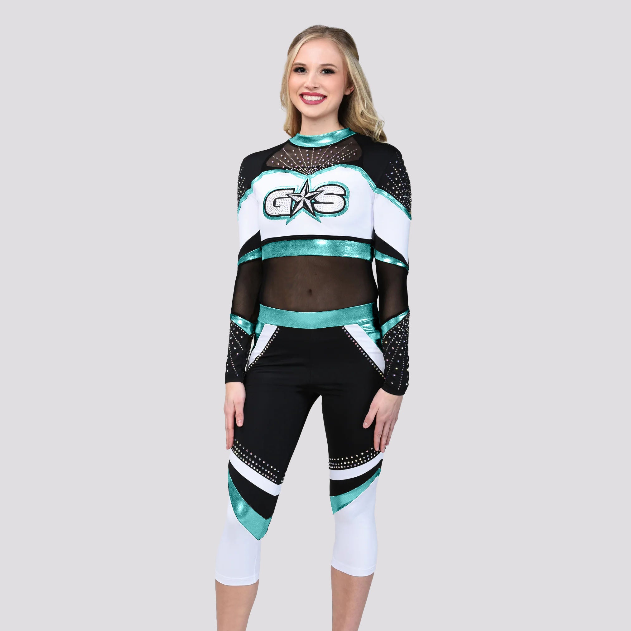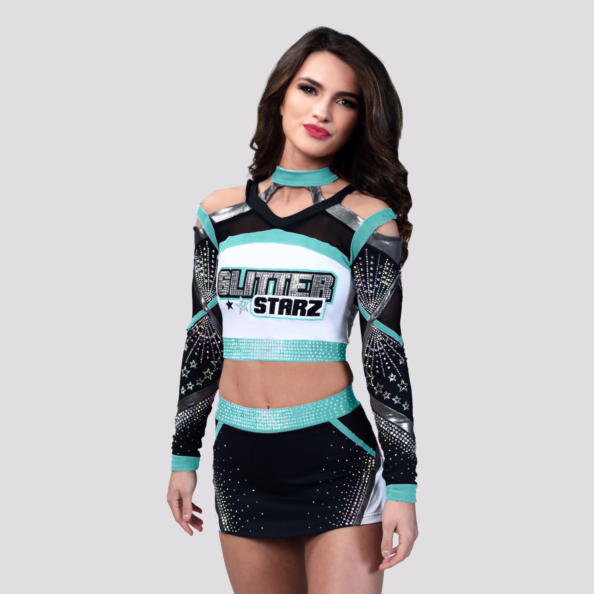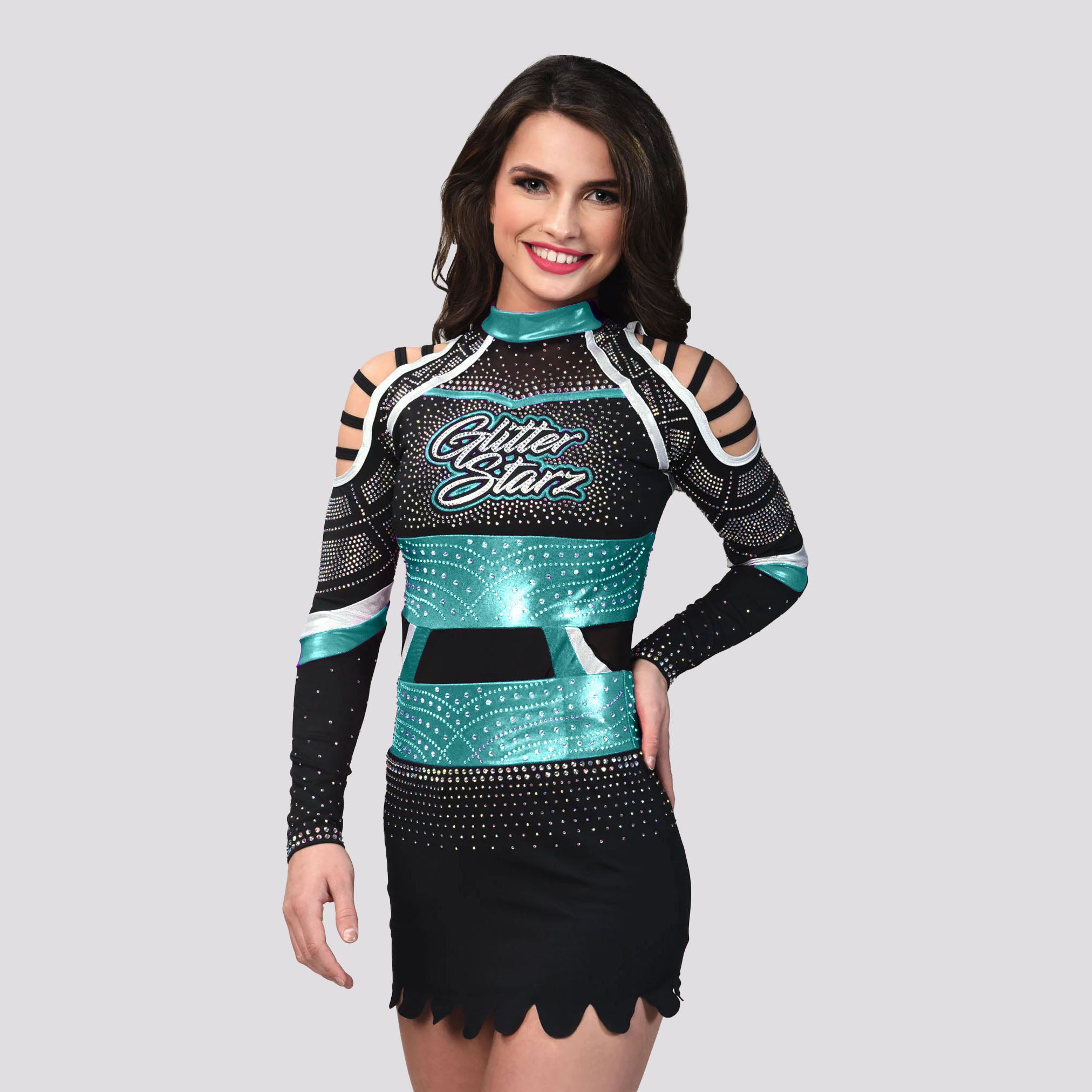 This uniform features a unique rhinestone pattern on sleeves, shoulder cutouts, high neck, and mesh inserts !  Customize to fit your team's colors, logo, fabrics, and top/bottom type.  Top type shown: Long sleeve crop top Bottom...
