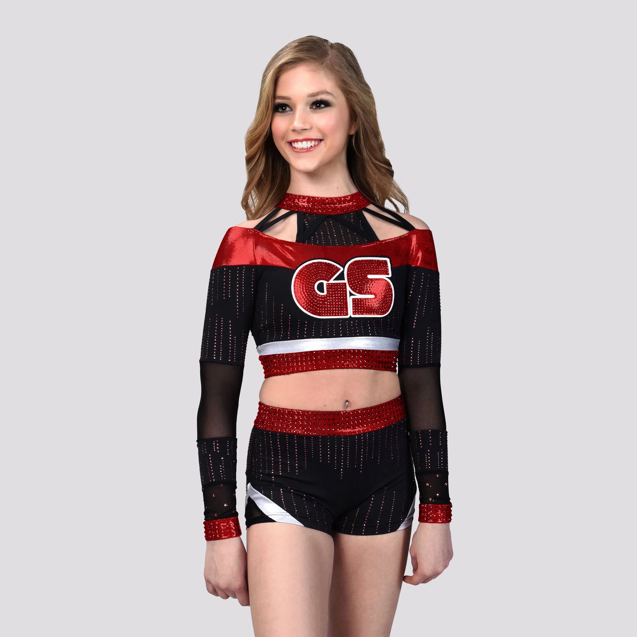 This Cheer uniform features a choker style top with bling around the neck and shorts.      Customize to fit your team's colors, logo, fabrics, and top/bottom type.      Top type shown: Long sleeve top leotard  ...