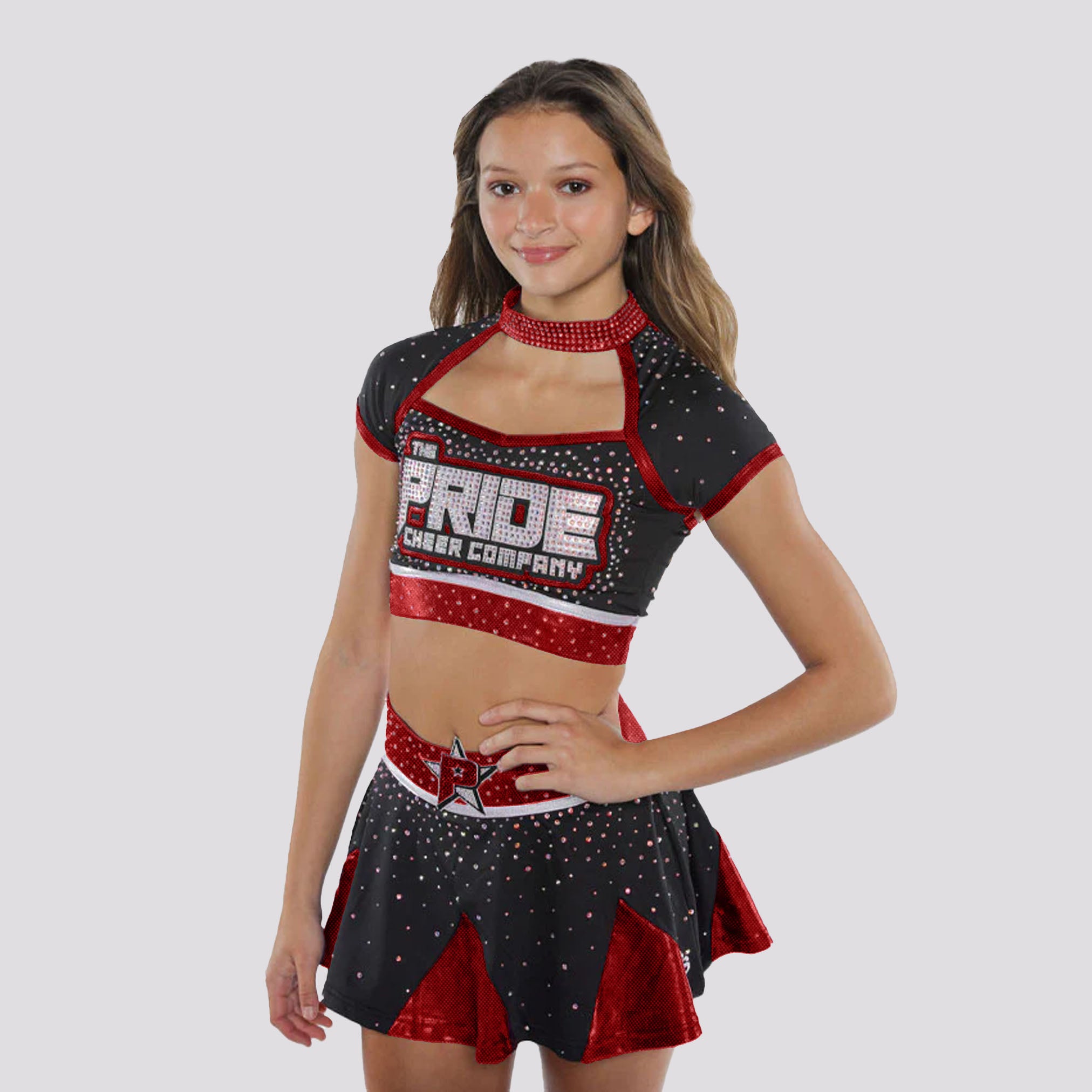 This uniform features a crop top with shoulder cut outs and designs on the back with rhinestones covering the neckline.    Customize to fit your team's colors, logo, fabrics, and top/bottom type.    Top type shown: Leotard,...