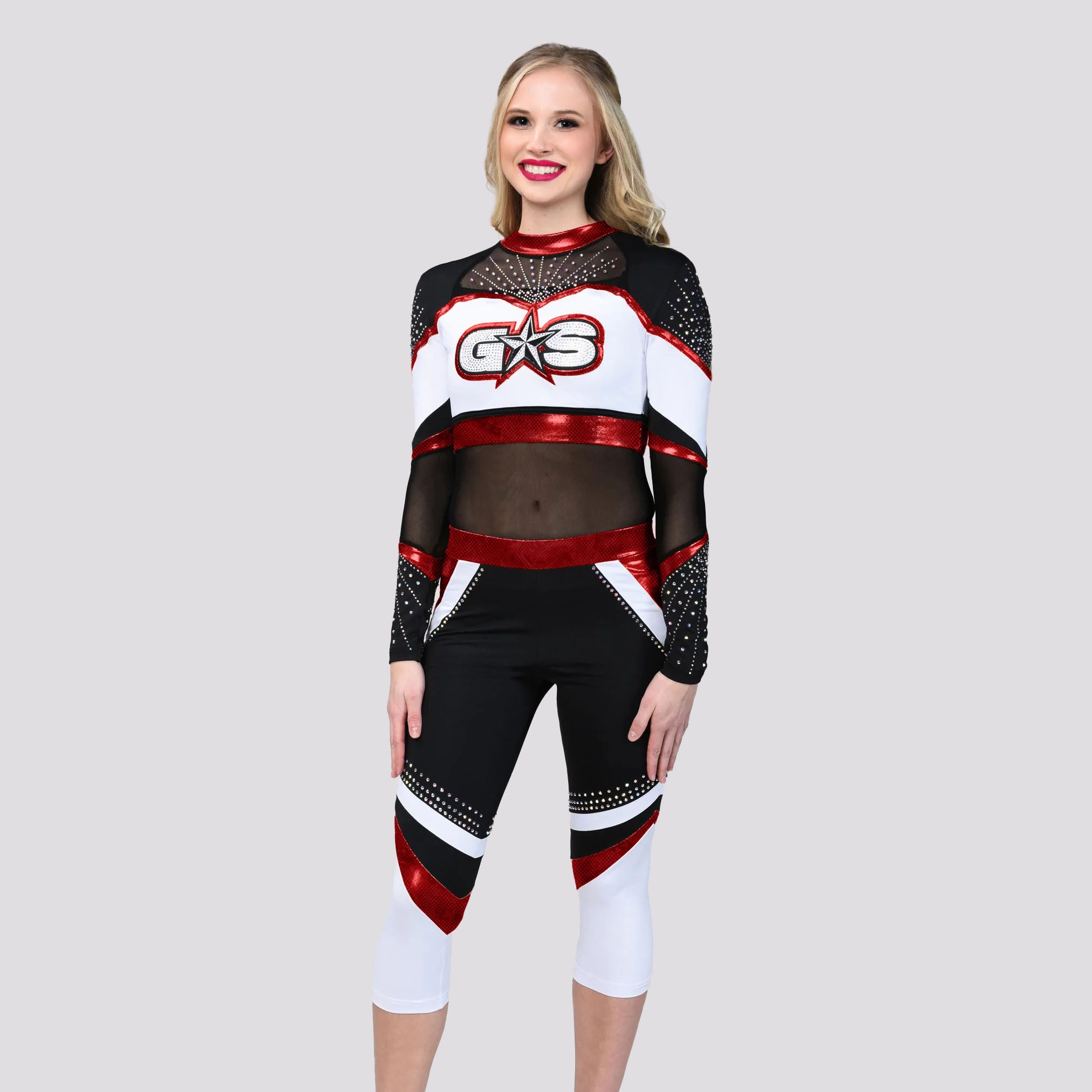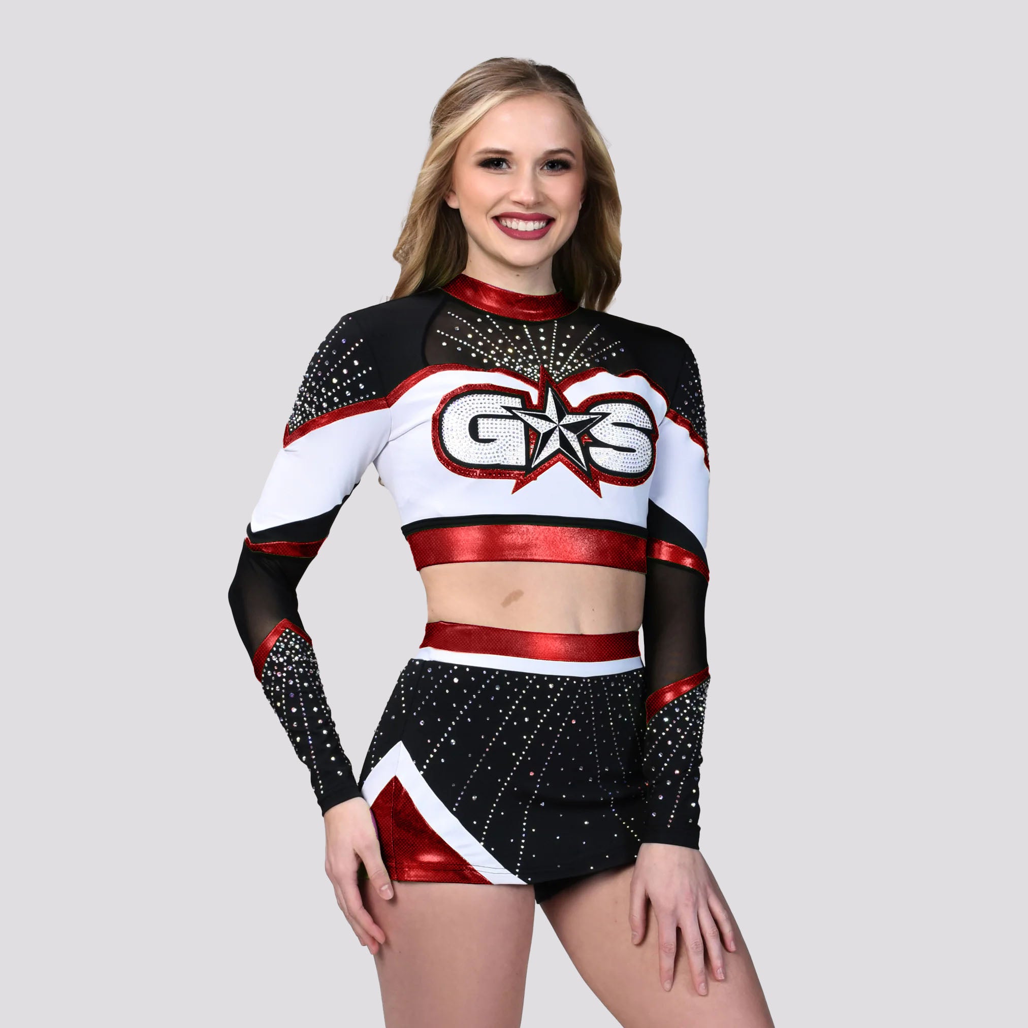 This uniform features a unique rhinestone pattern on sleeves, shoulder cutouts, high neck, and mesh inserts !  Customize to fit your team's colors, logo, fabrics, and top/bottom type.  Top type shown: Long sleeve crop top Bottom...