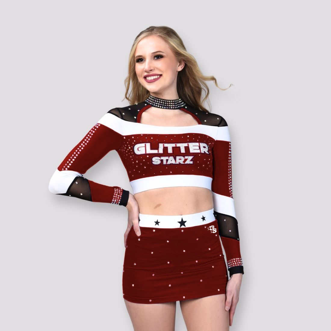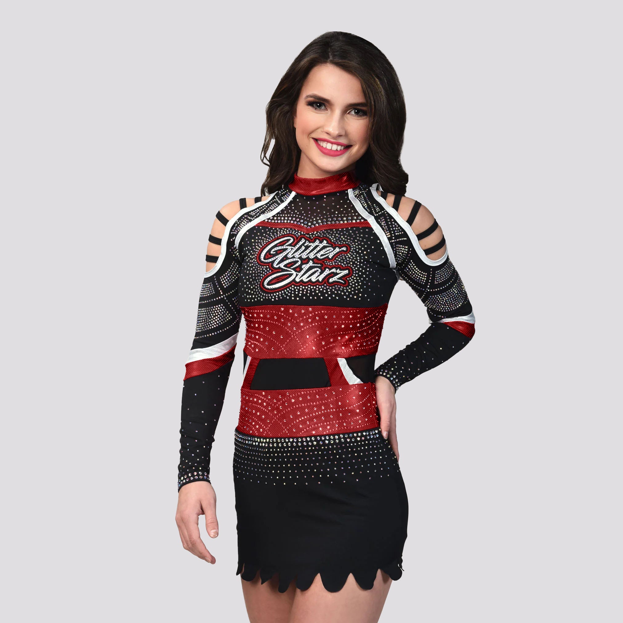 This uniform features a crop top with shoulder cut outs and designs on the back with rhinestones covering the neckline.