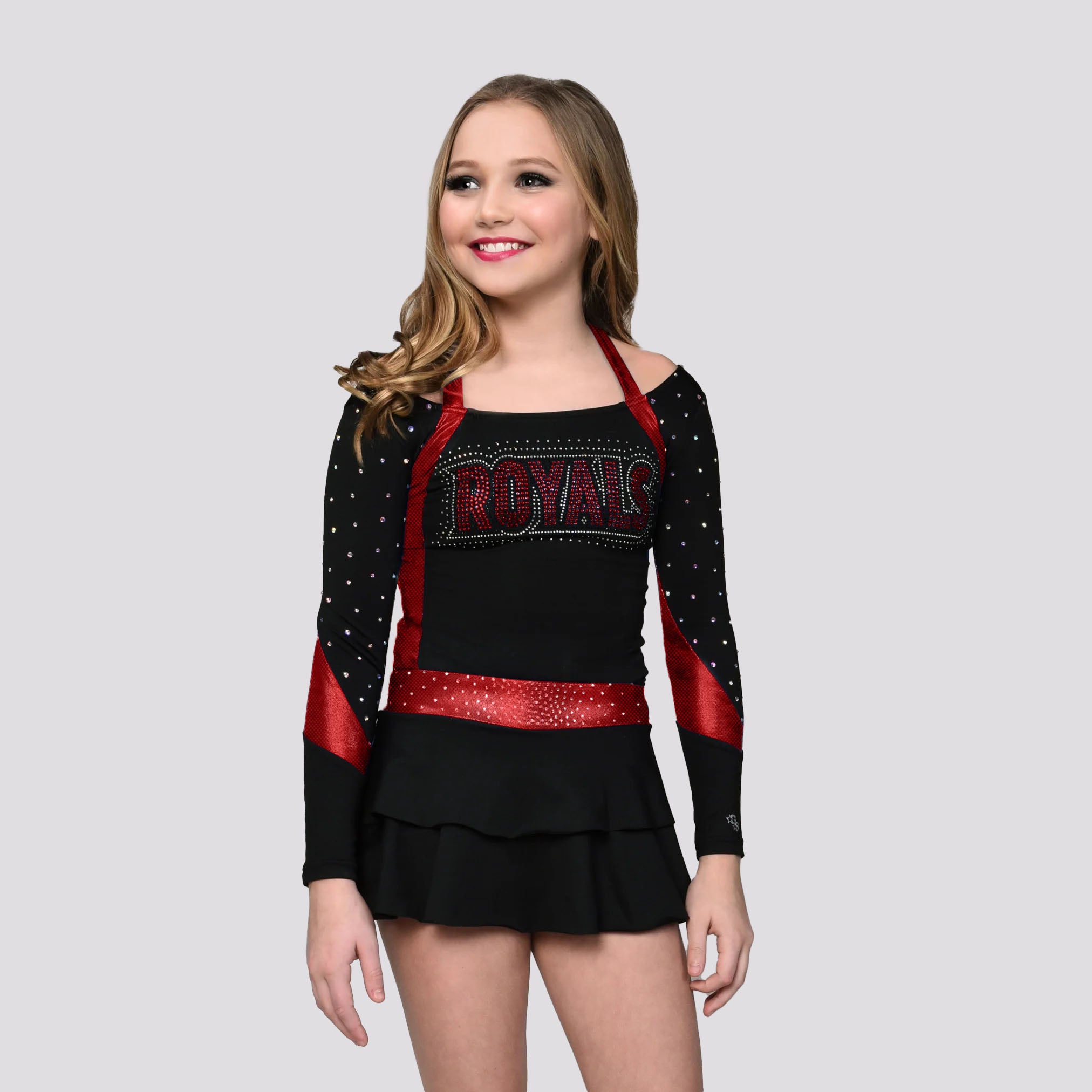 This Cheer uniform features a choker style top with bling around the neck and shorts.