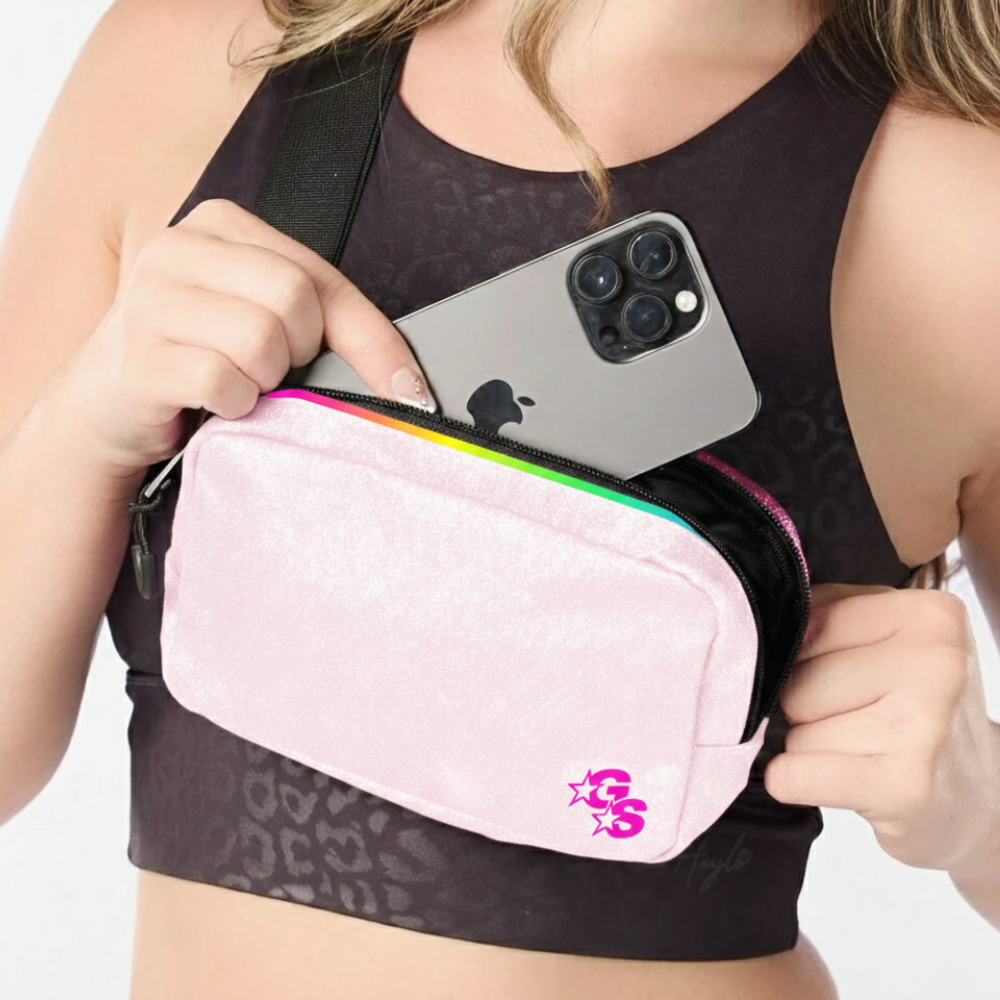 Make sparkle your everyday look with The Daily Bag from our BRB Sparkle Bag Collection. Sized perfectly at 7 x 5 x 1.25 inches with an adjustable buckle strap, this chic belt bag features a glittery finish, three interior mesh pockets, and an extra exterior pocket on the back. Practical, playful, and perfectly glam.